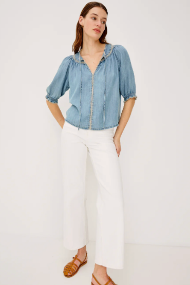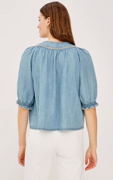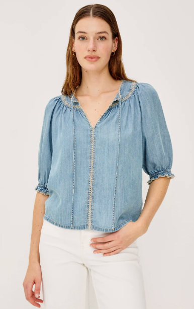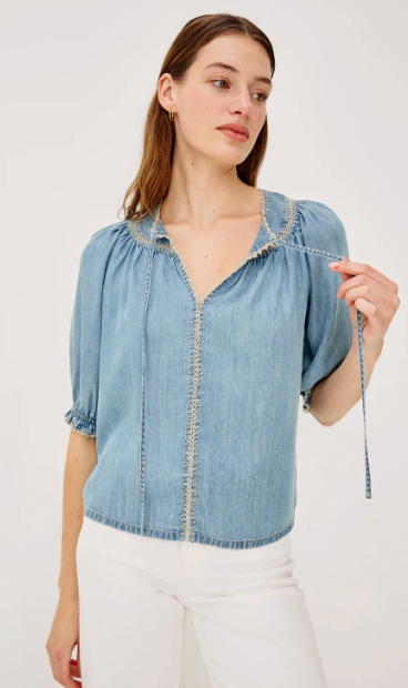 The Belina is an ultra-soft TENCEL denim top featuring a gathered, peasant-style V-neckline with self ties, blanket-stitch embroidered trim, a loose, flowing fit, and elbow-length sleeves with elastic ruffle cuffs.55% Linen | 45% Eco VeroImported.