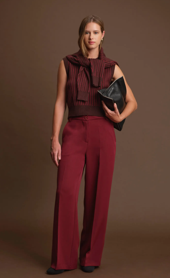 Allover stripes enhance the polish of this close-fitting sweater-vest anchored by ribbed trim.