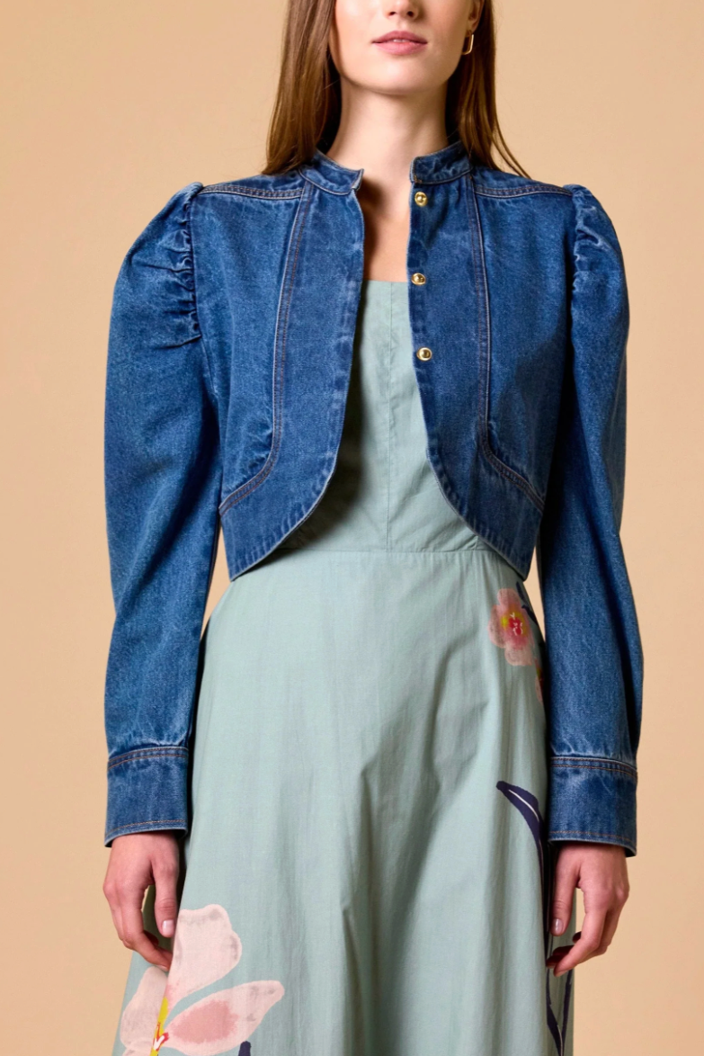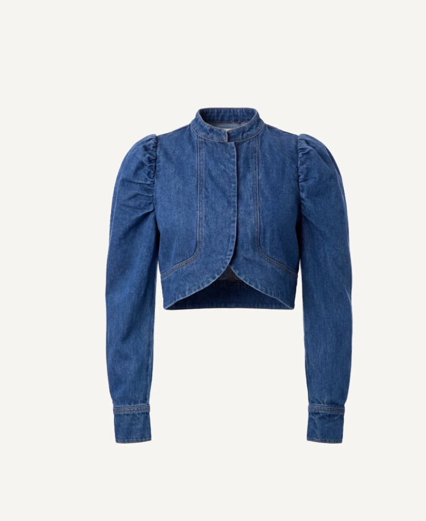 Crafted from 100% cotton, the Damien Denim Jacket is defined by its cropped silhouette, romantic long puff sleeves, and a refined mock neckline make this an elevated take on timeless denim.