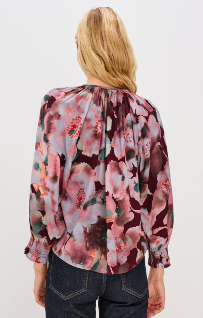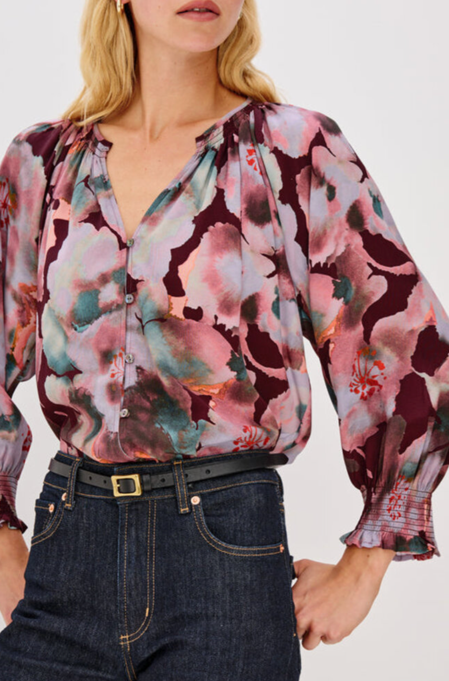 An ultra-soft rayon crepe blouse designed to keep you comforable. The Mariah features three-quarter sleeves with shirred cuffs, a roomy fit and natural shell buttons.