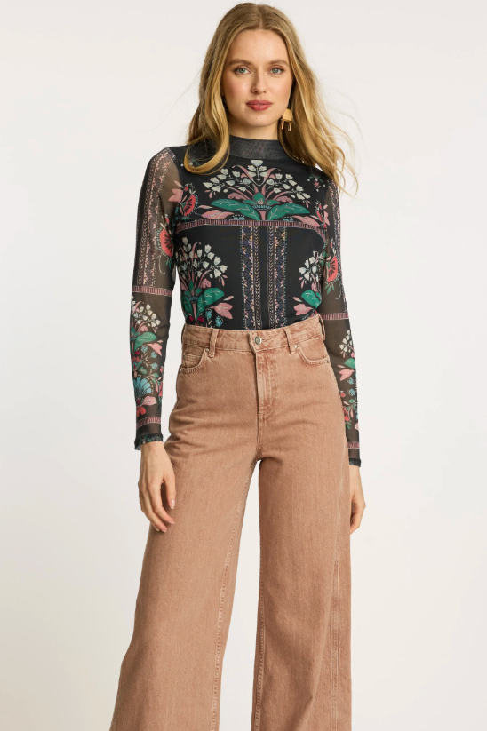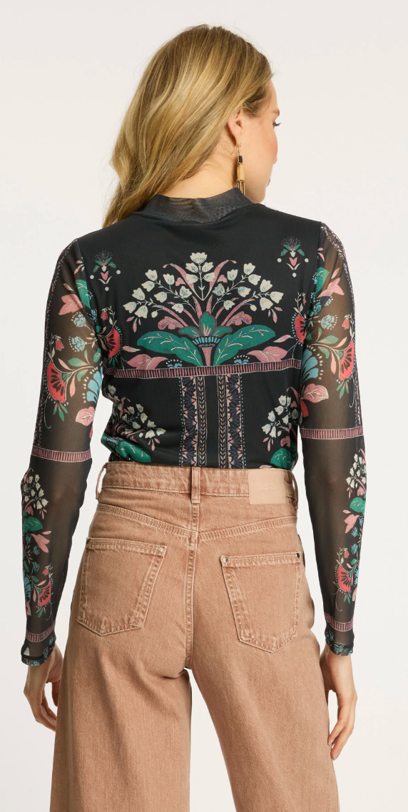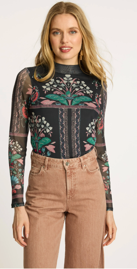 The Marta Top in Twilight Bloom brings together modern sophistication and artistic flair. Crafted from sleek, breathable powermesh, it features a striking floral print of stylized blossoms and leafy motifs in soft coral, dusty teal, blush, and ivory tones set against a deep blue background. The result is a look that feels both romantic and bold.