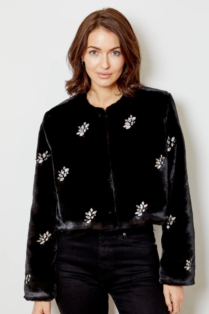 Crystal embellished faux fur jacket- Front hook and eye closure- Faux leather interior facing at front opening and neckline- Full lining