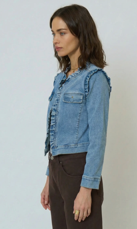 This cropped denim jacket stands out with ruffle trim along the collar and placket, paired with a tailored fit, functional chest pockets, and stretch fabric that keeps it comfortable yet polished all day.