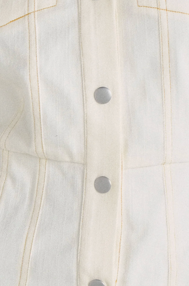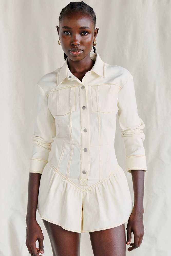 Our Rhea romper is back from our fall season, this time in a butter hue. This denim dream features cheeky ruffle shorts, a collar to keep things sophisticated, and long sleeves- perfect for cuffing. The light butter color is perfect for the season, the apricot colored top stitching adds extra detail and subtle contrast to the neutral number. Pair the one piece with a colored shoe & bag as a fun pop!