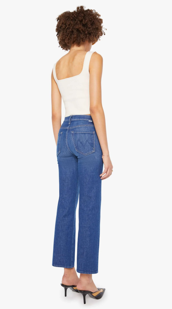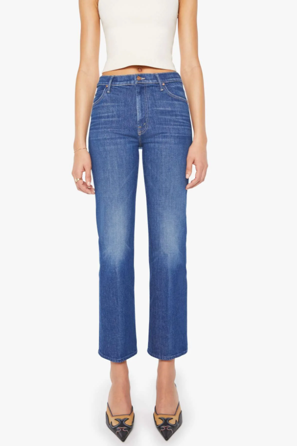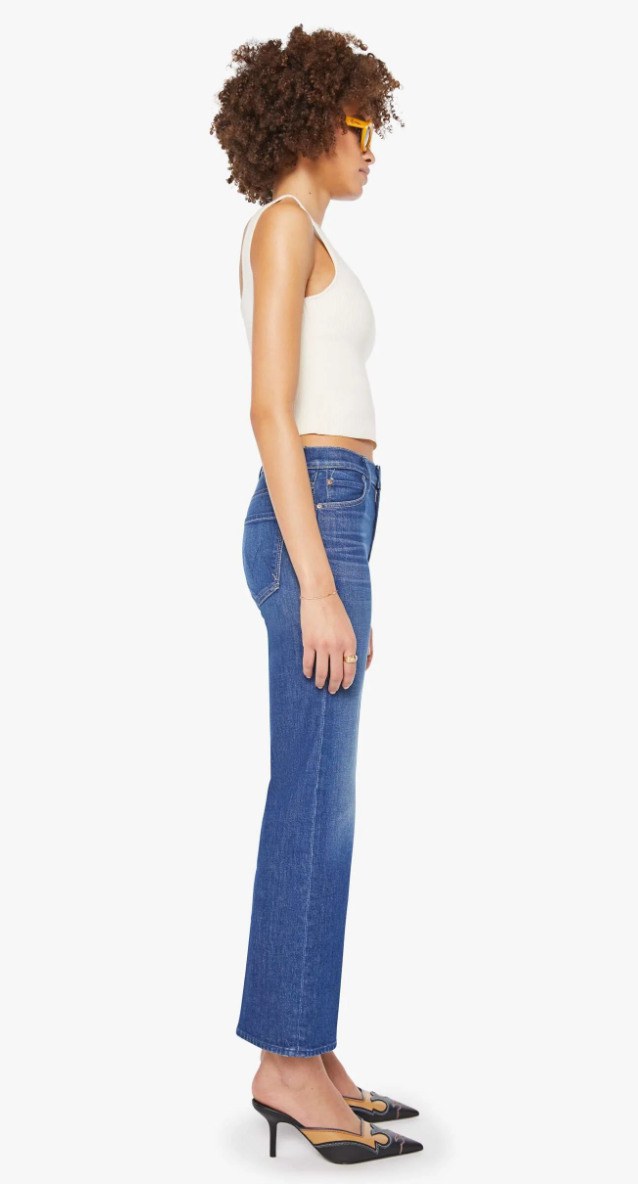 A high-rise straight leg jean with a zip fly, 28.25-inch inseam and a clean hem. Made from denim with a touch of stretch, Do Not Disturb is a mid-blue with whiskering and fading at the knee.