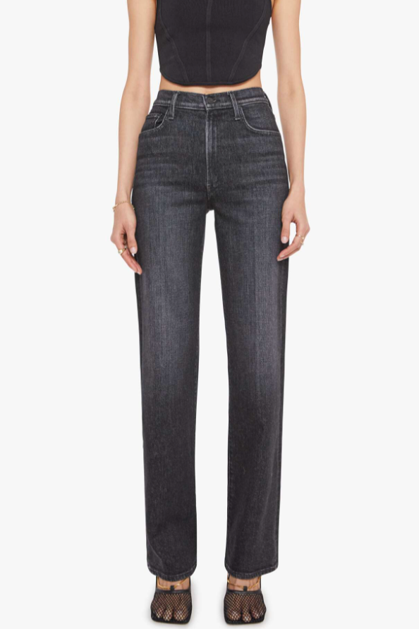 A cut above. High-waisted jeans with a wide straight leg, zip fly and a long 34-inch inseam with a clean hem. Cut from a blend of recycled stretch denim, Keep It Sharp is a washed black with subtle whiskering, fading and tonal hardware.